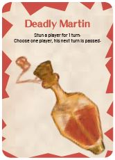 When you play this card, place it in front of one player of your choice. His next turn is skipped, then place this card in the discard pile.