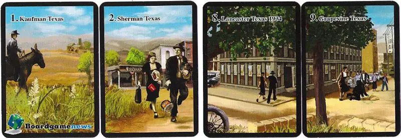 Place the game board in between the players. Note it has 10 Locations on it, from Kaufman Texas to Gibson Louisiana.