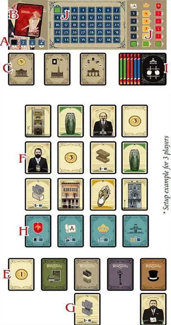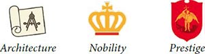 I.One of their markers on the first square of the Victory Point (VP) track and one on the first square of the Architecture, Nobility, and Prestige tracks