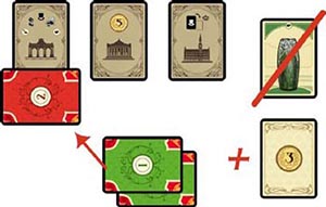 Example: Claudia (green) wants to sell an Artwork. There are 2 Money cards in the Art Nouveau area, but Claudia is out of money. Therefore, she is forced to activate the Cinquantenaire Park in order to sell her Artwork.