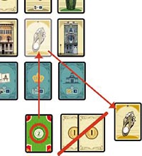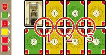 Example: John (yellow) has played a total of 3 Architect cards in the Brussels area. Claudia (green) played 2 and Rob (red)played 1. Therefore, John must place one of his 3 cards underneath the Prison card.
