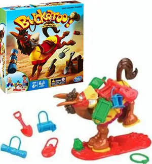 Load gear onto Buckaroo without making him buck. If he bucks, or if any gear falls off, you're out of the game. To win, load the last piece, or be the last player left in the game.