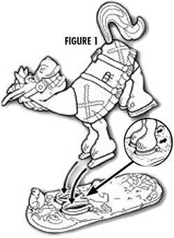 Attach Buckaroo's front legs to the base, by sliding the foot tabs forward i into the runners. Then press the feet all the way down, until they snap into place, and slide back. See Figure 1.