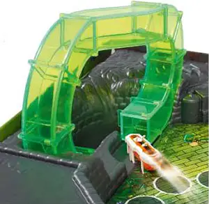 The HEXBUG nano V2 runs into the loop and disappears under the game surface.
