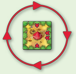 The placement of Worker tiles can trigger the filling of Jungle spaces. If the newly placed Worker tile causes an empty Jungle space to be bordered by 2 or more Worker tiles, that Jungle space must be filled. To whom the bordering Worker tiles belong does not matter. It is possible that several Jungle spaces must be filled in a single turn.