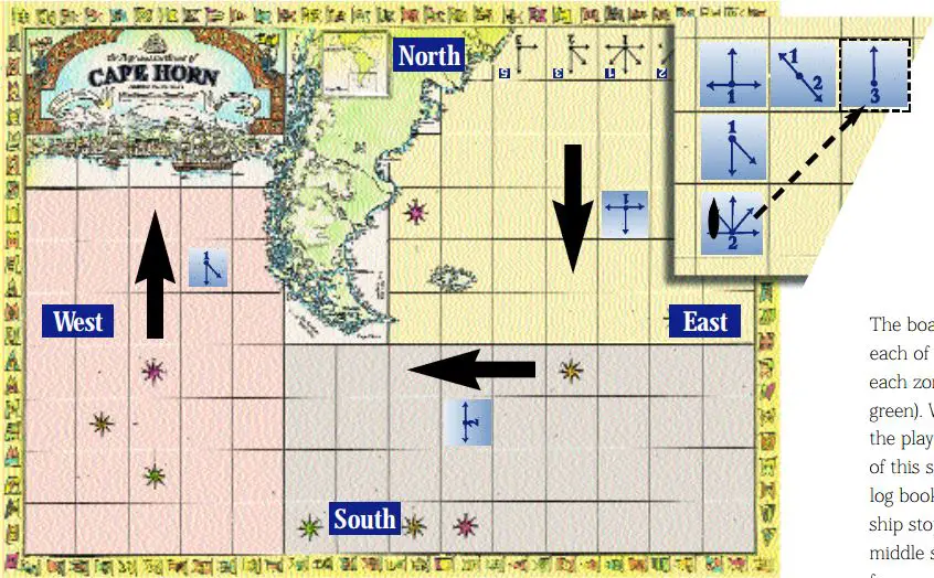 The race around Cape Horn is divided into three zones. In each zone, there are three nautical stations which players can sail through to acquire a station token.