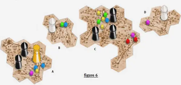 As the white player has castles on A and C, he merges the three territories into one. He may fit them together any way he wants. The new territory contains the 3 old territories, 6 paladins, and 3 castles as shown in figure 4.