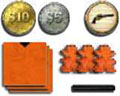 Every player gets $15, 1 road, 12 property tiles of his color and 3 cowboys of his color. Roads and cowboys constitute the personal reserve of the player.