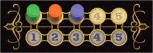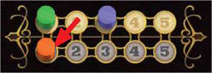 When a player chooses to pass, he moves his marker onto the first free position of the lower turn order track. In the example above, Orange is the first player to pass.