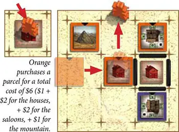 The parcel price is $1, plus $1 for every building, mountain or house situated on this parcel or next to it (including diagonally). The amount is paid to the Central Bank and the player must place a property tile of his color (the cowboy goes to the general reserve).