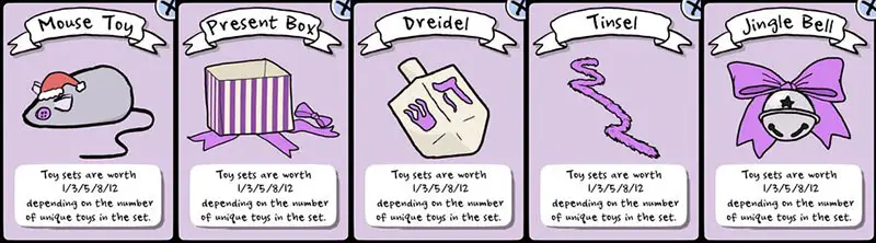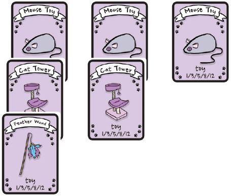 Example: Kat ends the game with 1 feather wand, 2 cat towers, and 3 mouse toys. She has one set of 3 unique toys and scores 5 VP. The set of a cat tower and mouse toy scores 3 VP. The single mouse toy scores 1 VP.