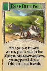 You must follow all the normal building rules. If you are also playing with the Seafarers expansion, you may build 2 roads, 1 road and 1 ship, or 2 ships when you play this card.
