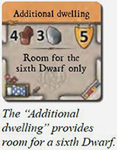 There are 6 different types of Dwellings. Every Dwelling provides room for one or two Dwarfs.