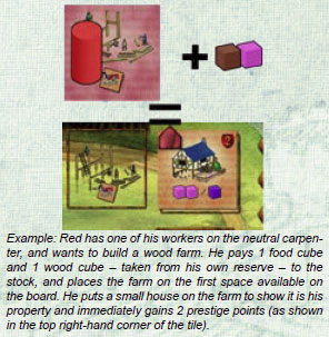 It is only possible to build a building if it is still available in the stock. To build a craft building, the player has to pay its price in cubes (the price is given in the top left-hand corner of the tile) with their own stock.