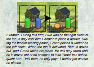 If the worker is placed in the inn, the player puts him on the circle on the left. As a consequence, this worker will possibly spend some time with another worker placed on the other circle on the right (one player may have two of their workers in the inn simultaneously).