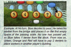 If a player wants to pass or must pass because of a lack of workers or money, they put their color marker (located on the bridge) on the first available space (that is, on the smallest unoccupied number) of the passing scale. The first player who passes gets 1 denier from the stock immediately.