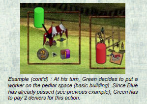 The player who occupies the circle on the right always pays 1 denier to place their workers, no matter how many players have passed (the player's opponents still gain 1 prestige point every time the former uses their buildings).