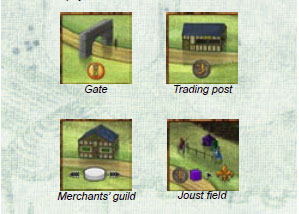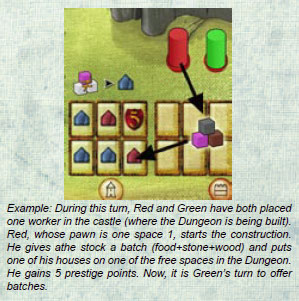 Every time a player gives the stock a batch, he has the right to put a house in the section of the castle which is currently under construction (as we'll see below, it is the bailiff's progress on the board which determines which section is under construction). If there is no more room in this section, the player may start building the next section (nevertheless, if the players are building the Towers - which are the last section - it is possible that some of them will not be able to give batches).