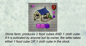 Furthermore, if a stone production building (gray background) is activated by anyone but its owner, the latter takes one resource cube (chosen among the resources produced by the building) in the stock. If the building is activated by its owner, the latter takes the normal income granted by the building, but no additional cube.