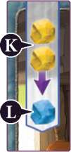 When playing a Trade card, return the number and color of crystal(s) shown above the arrow K from your caravan to the diamond-shaped bowls, then take the number and color of crystal(s) shown below the arrow L from the bowls and add them to your caravan. A trade can be done any number of times in a row as long as you have the appropriate crystals available.