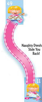 For example, if you end your move on square #49, you must immediately move down to square #11. Again, the pictures are related. Eating too many cookies can give you a tummy-ache!