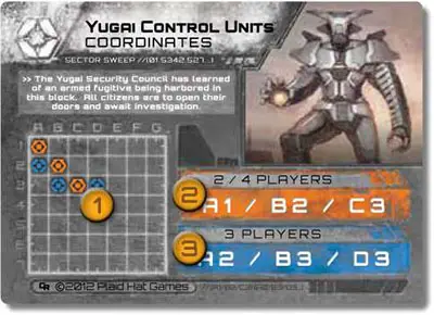 During the Yugai Patrol Phase of each round a YCU (Yugai Control Unit) coordi- nates card is revealed. This determines where YCU tokens are placed on the board. Anatomy of a YCU Coordinates Card