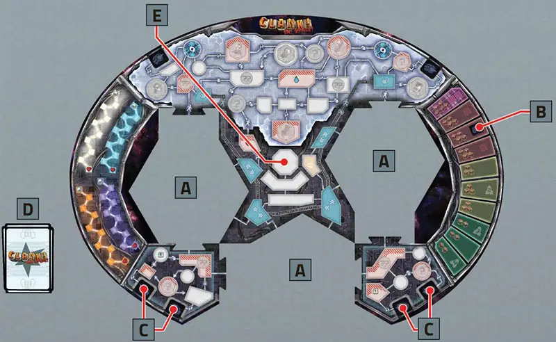 C The four 20-point Escape Pods from CLANK!IN!SPACE! go along the lower edge of the board.