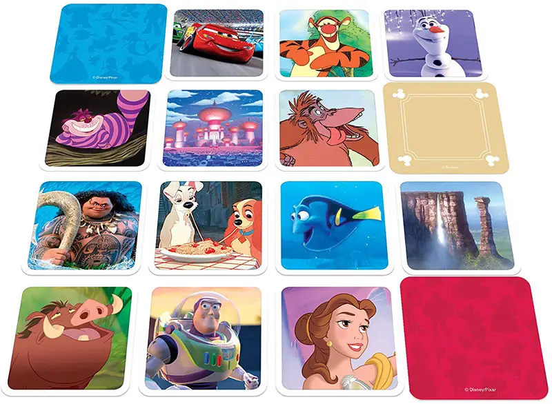 Two opposing teams are competing to be the first to identify all of their team's Disney Treasure Cards from among 16 cards displayed in a 4 x 4 grid.