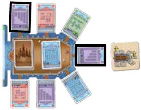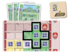 Instead of having to choose between the two actions the player may use this tile to perform both actions during their turn once only. First, they perform the action Take cards, followed by the action Construct facade. The player refills the card display only at the end of their turn.