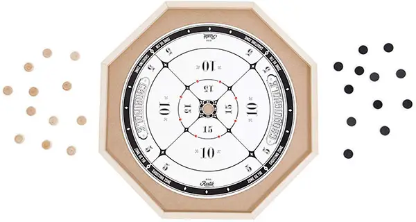 Board dimensions vary with a playing surface typically of polished wood or laminate approximately 27 inches in diameter. The arrangement is 3 concentric rings worth 5, 10, and 15 points as you move in from the outside. There is a shallow 20 point hole at the center. The inner 15 point ring is guarded with 8 small bumpers or posts.