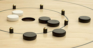 Option One: Play two versus one. Two players divide one set of disks, 6 each, and play as partners on opposite quadrants. The third player receives 12 disks, shooting one disk every other turn, always shooting from a single quadrant. Score the same as a two- or four-player/ partnership game.