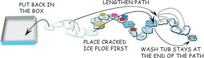 The first ice floe is put back in the box. The other five ice floes are repositioned between the next to the last ice floe and the wash tub to make the path to the wash tub longer. The cracked ice floe is laid first.