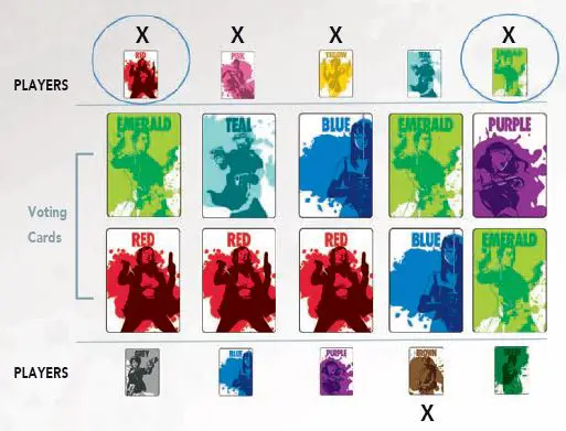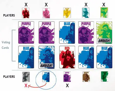 If a player suspects they are the Target of the group, they may defend themselves by playing their Ambush card instead of choosing another player's card. Once all players have placed their Voting cards down, they reveal their choices at the same time and resolve the outcome.