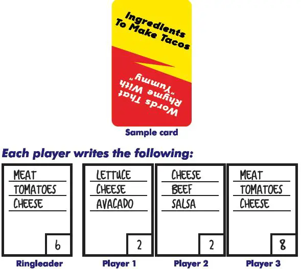 The Ringleader chooses one of the two categories listed on the card, reads it aloud to the group, and flips the 30-second timer.All players, including the Ringleader, quickly write down 3 answers relating to the category on their score sheets. Players should try to match the 3 answers they think the Ringleader will write down.