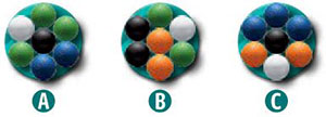 Each player takes 15 spheres. Place three spheres of each color (orange, blue, green, black, and white) in the five slots in your tray. Do not fill the round holes yet. (In a game with fewer than four players, the remaining spheres remain in the box; they are not required).