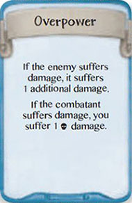 The "Overpower" support card deals additional damage to the defender. If the attacker suffers damage, the survivor who played this card suffers one 9 (physical) damage.