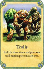 Roll the die three times and place one troll piece in each area of the same number. More than one troll can end up in an area. Remember to place a trouble marker if there is already one or more minions in the area.