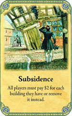 All players must pay $2 for each building they have on the board. If they cannot pay for a building then it is removed from the board.