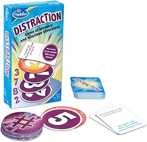 Choose to play using either the purple questions or the blue questions on the Distraction Cards. The two colors provide variety. If you play your first game using the blue questions, mix it up by using the purple questions during your next game.