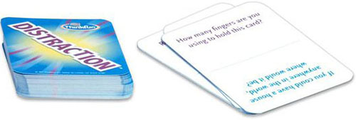 Note: During a game, if all the Distraction Cards are used, simply shuffle the discarded deck and continue using the other colored questions.