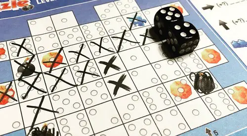 Should there not be a die with a corresponding number, then the player is lucky and does not have to remove a die. Should both dice show the same number, then two dice with the number (if available) are removed.