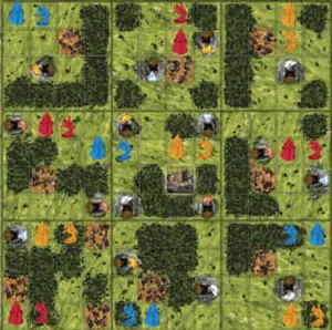 Example: Blue created a Domaine with a village, a forest, and a mine in the right comer using only 6 borders. Orange is still 2 borders short of enclosing a Domaine Red does not control a Domaine.