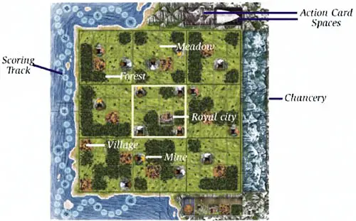 Assemble the board edge as shown. Always place the land tile with the royal city (with the walls and cathedral) In the center of the board. Shuffle the other tiles and place them face up in any order to fill in the board. It does not matter which direction the tiles are facing. Each tile is divided into sixteen territories of various types.