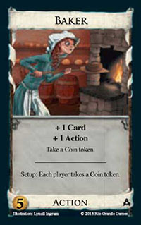 Baker![]() | Action | 5 Coin | +1 Card +1 Action Take a Coin token. Setup: Each player takes a Coin token |