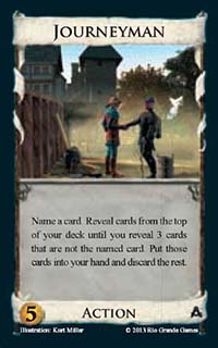Journeyman![]() | Action | 5 Coin | Name a card. Reveal cards from the top of your deck until you reveal 3 cards that are not the named card. Put those cards into your hand and discard the rest |