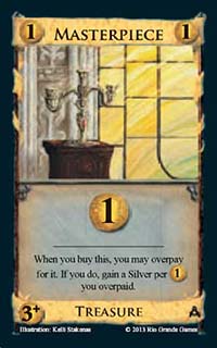Masterpiece![]() | Treasure | 3+ Coin | Worth 1 Coin When you buy this, you may overpay for it. If you do, gain a Silver per $1 you overpaid |