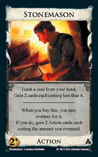 Stonemason![]() | Action | 2+ Coin | Trash a card from your hand. Gain 2 cards each costing less than it. When you buy this, you may overpay for it. If you do, gain 2 Action cards each costing the amount you overpaid |