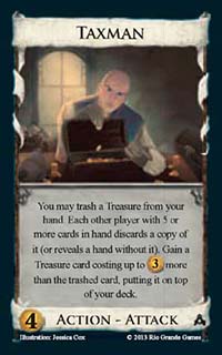 Taxman![]() | Action - Attack | 4 Coin | You may trash a Treasure from your hand. Each other player with 5 or more cards in hand discards a copy of it (or reveals a hand without it). Gain a Treasure card costing up to $3 more than the trashed card, putting it on top of your deck |