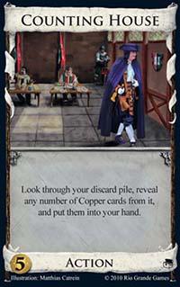 Counting House![]() | Action | $5 | Look through your discard pile, reveal any number of Copper cards from it, and put them into your hand |