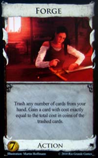 Forge![]() | Action | $7 | Trash any number of cards from your hand. Gain a card with cost exactly equal to the total cost in coins of the trashed cards |